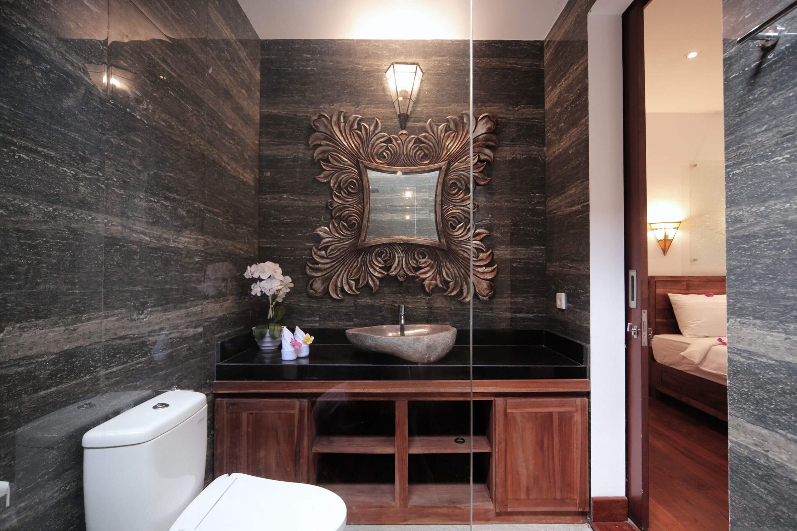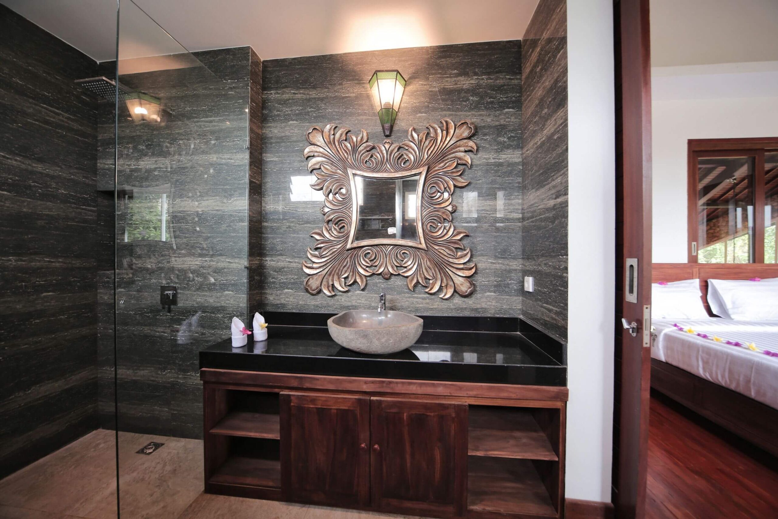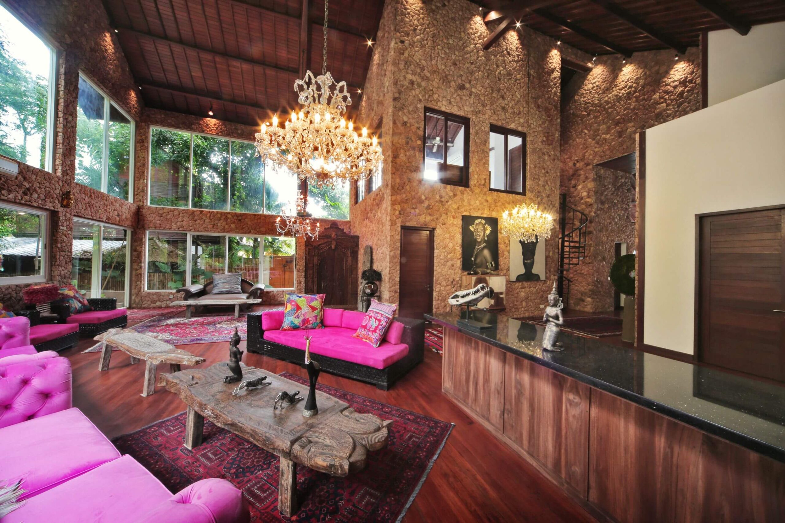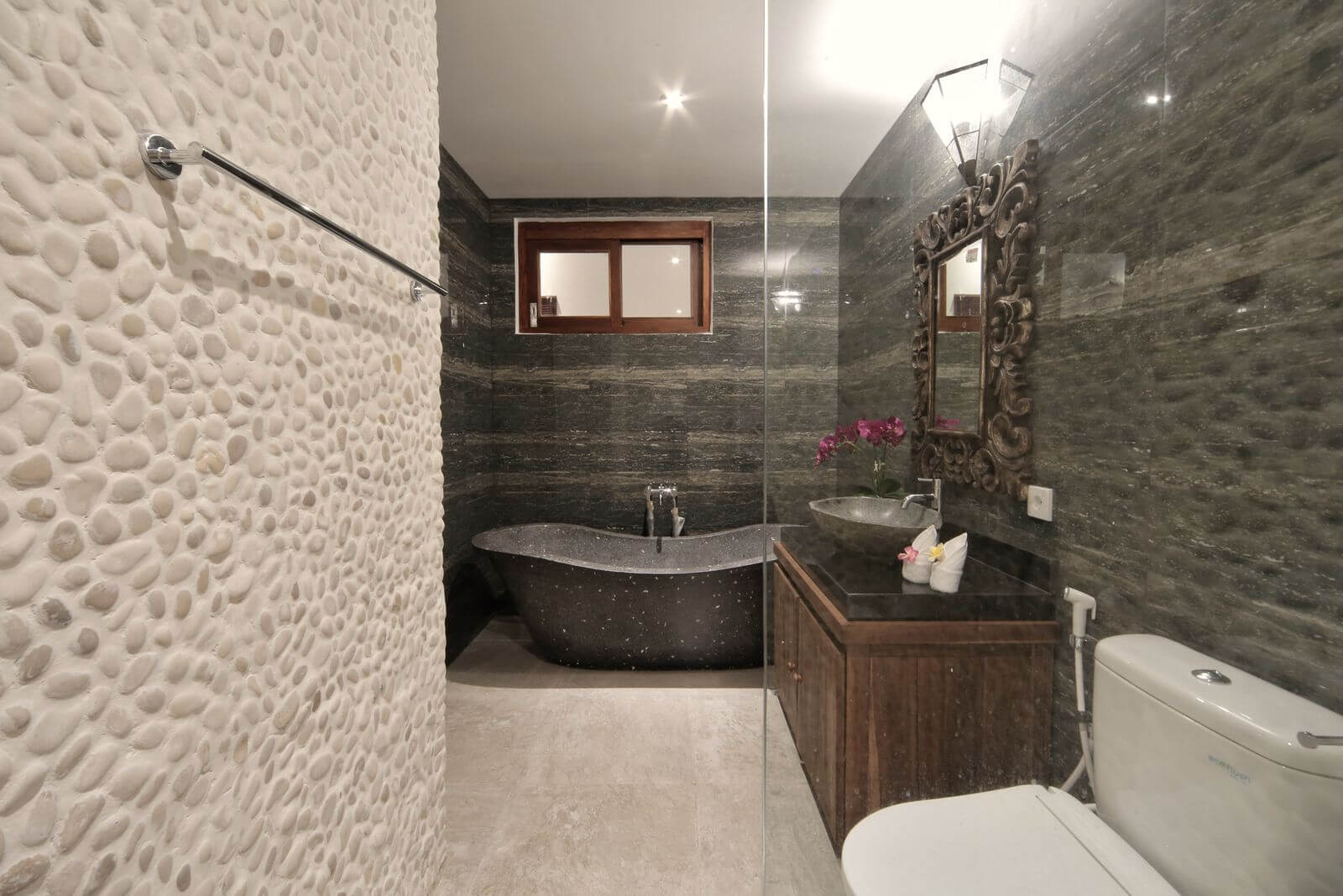 Villa Jeannie is located in the Lombok Tourist town of Senggigi an approx 10 minute walk to the beach which has bars and restaurants on all sides. Villa Jeannie is a new 6 bedroom 7 bathroom stone villa backing onto a jungle river leading to the ocean.